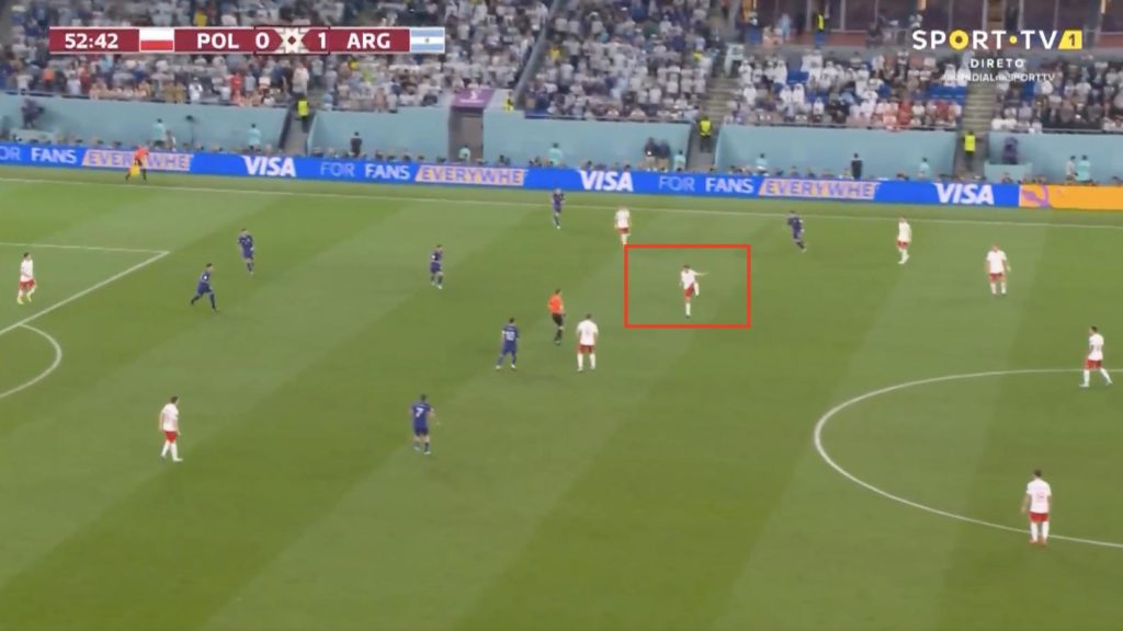 The kick is weak and straight down the middle of the pitch, and it lands straight at the feet of an opposition player, with Poland gaining the ball back without doing too much work.