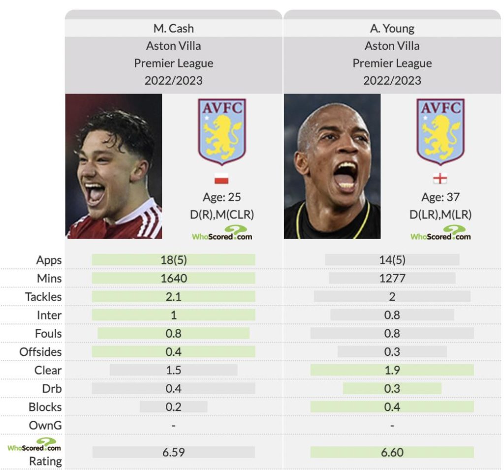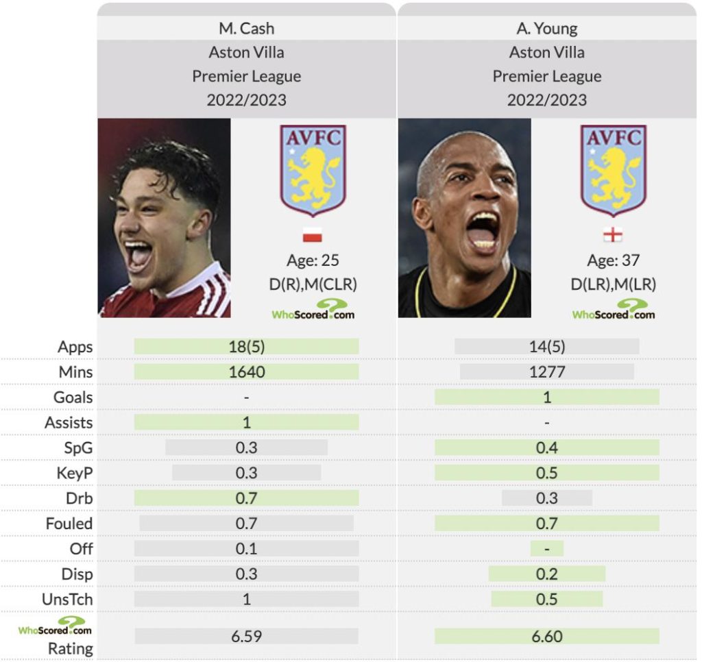 According to Whoscored, Young has managed more clearances, has been dribbled past less, and completed more blocks per 90 minutes. Granted, Cash does outperform the veteran in terms of tackles and interceptions, but it’s marginal. Furthermore, in an attacking sense, Young has outshone the 25-year-old.