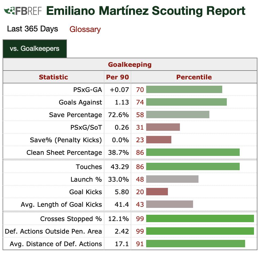 In the last year, Martinez has also been one of the world’s leading keepers in terms of dealing with crosses into the area, falling in the 99th percentile for percentage of crosses stopped in Europe’s top five leagues with an average of 12.1% per 90 minutes [Fbref].
