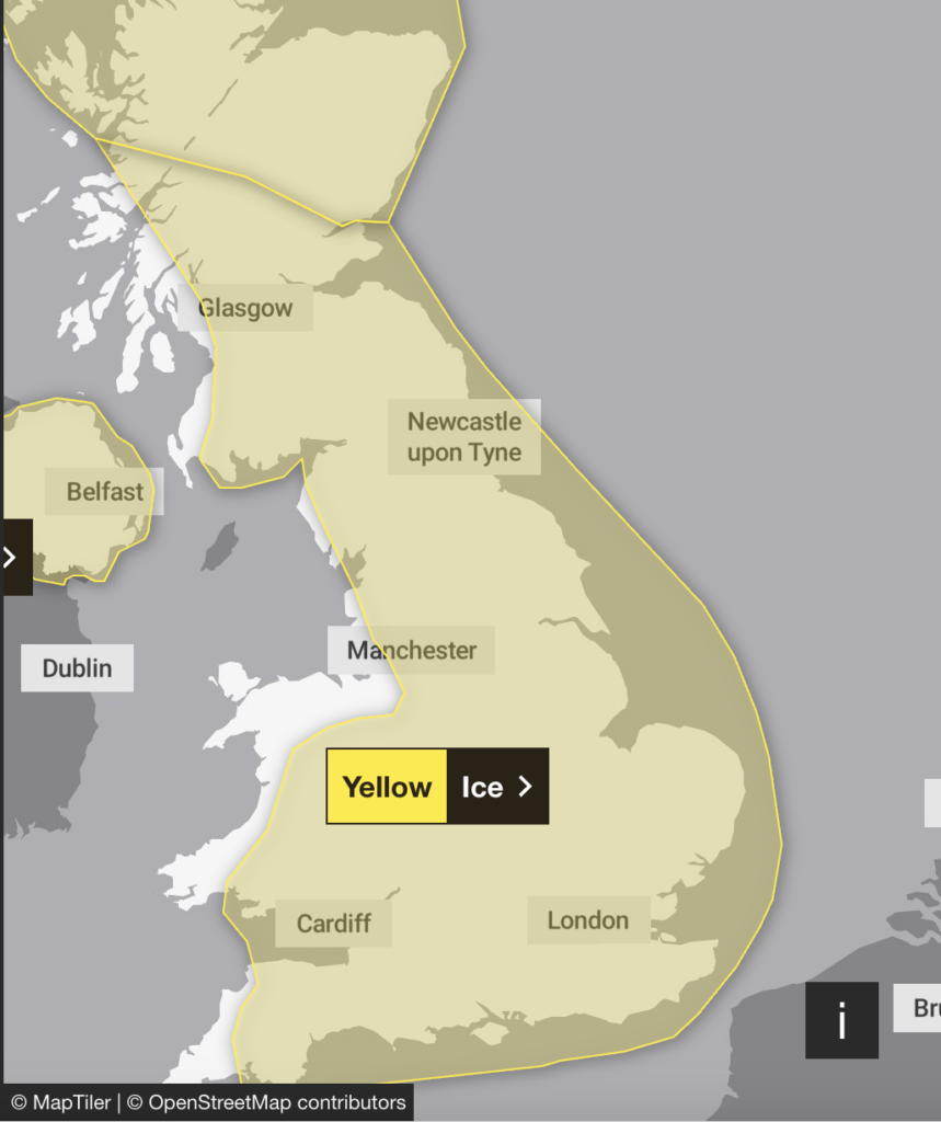 “Following a band of precipitation which clears southeast overnight, clear skies will develop for many areas on Tuesday night will lead to icy patches on untreated wet surfaces. This could lead to some minor disruption especially on Wednesday morning,” a statement read on January 6.