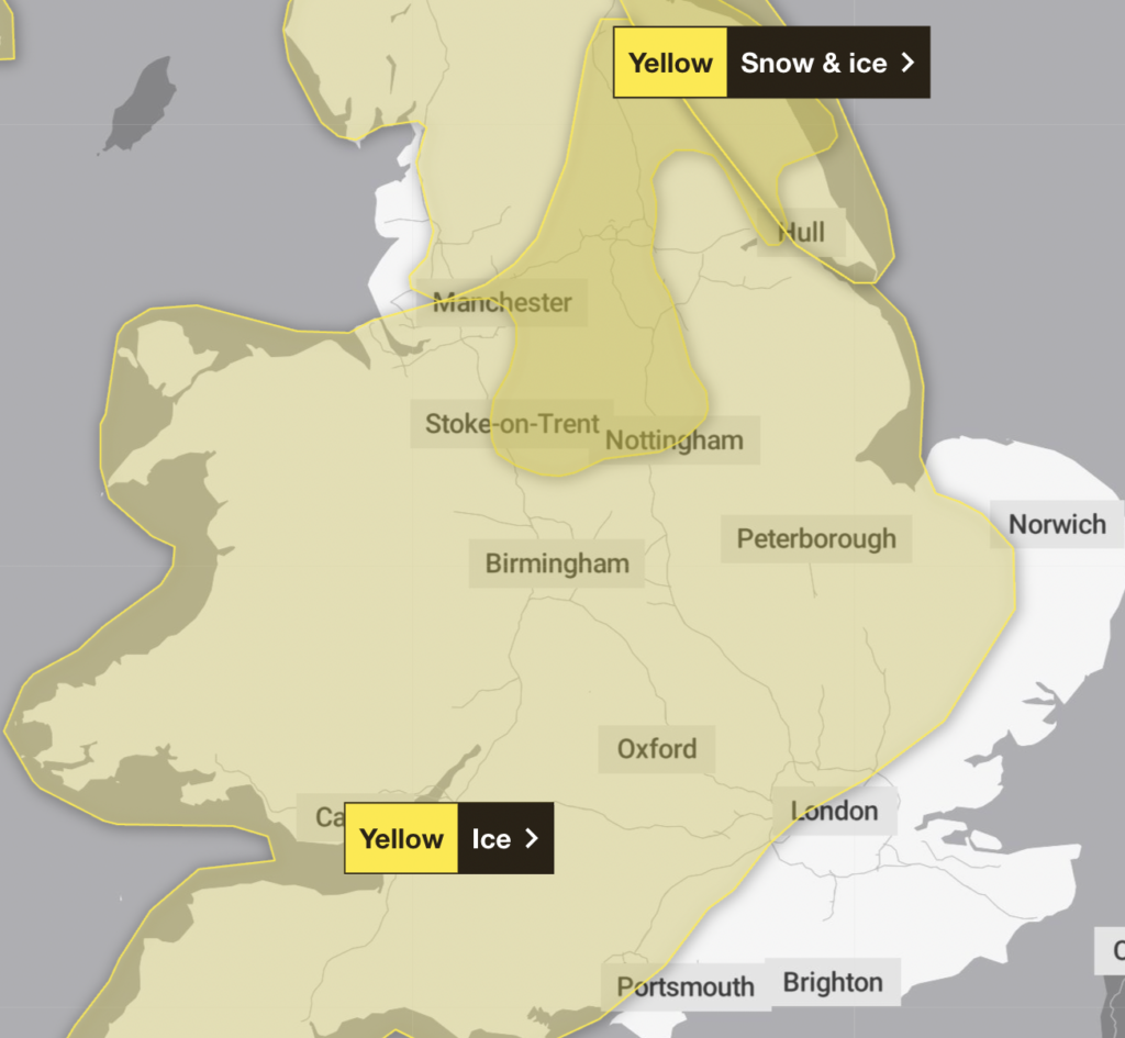 There is a yellow warning for ice in place on Friday and Saturday, as per the Met Office, but this will thankfully clear – as of 13 February – by the time the game kicks off at 5:45pm.